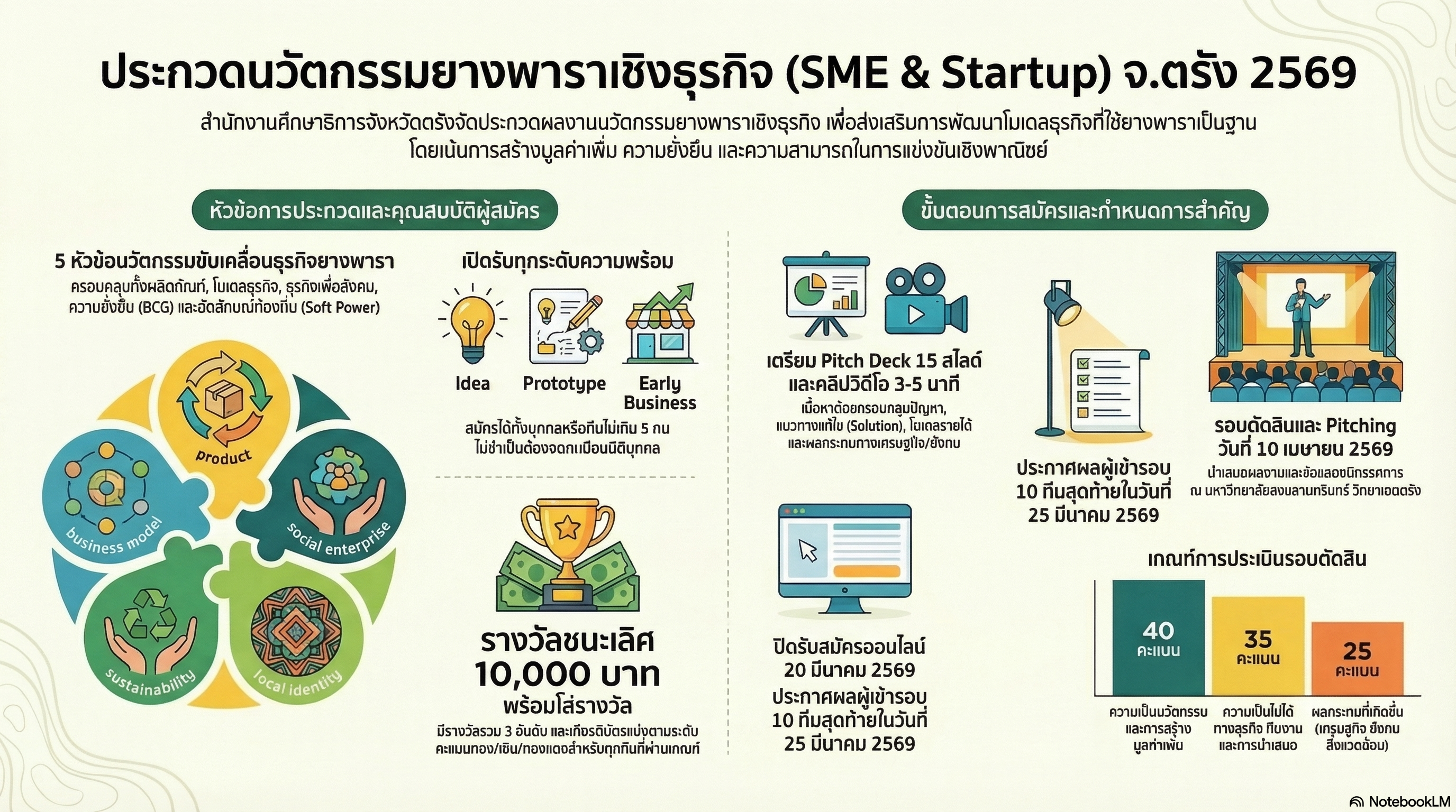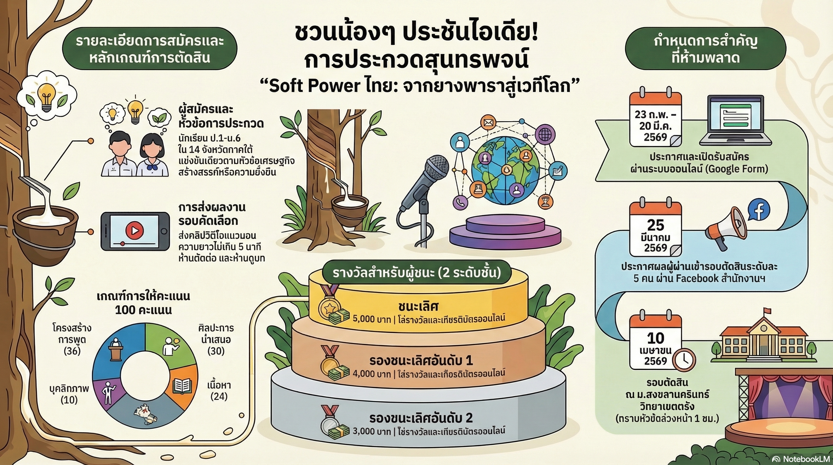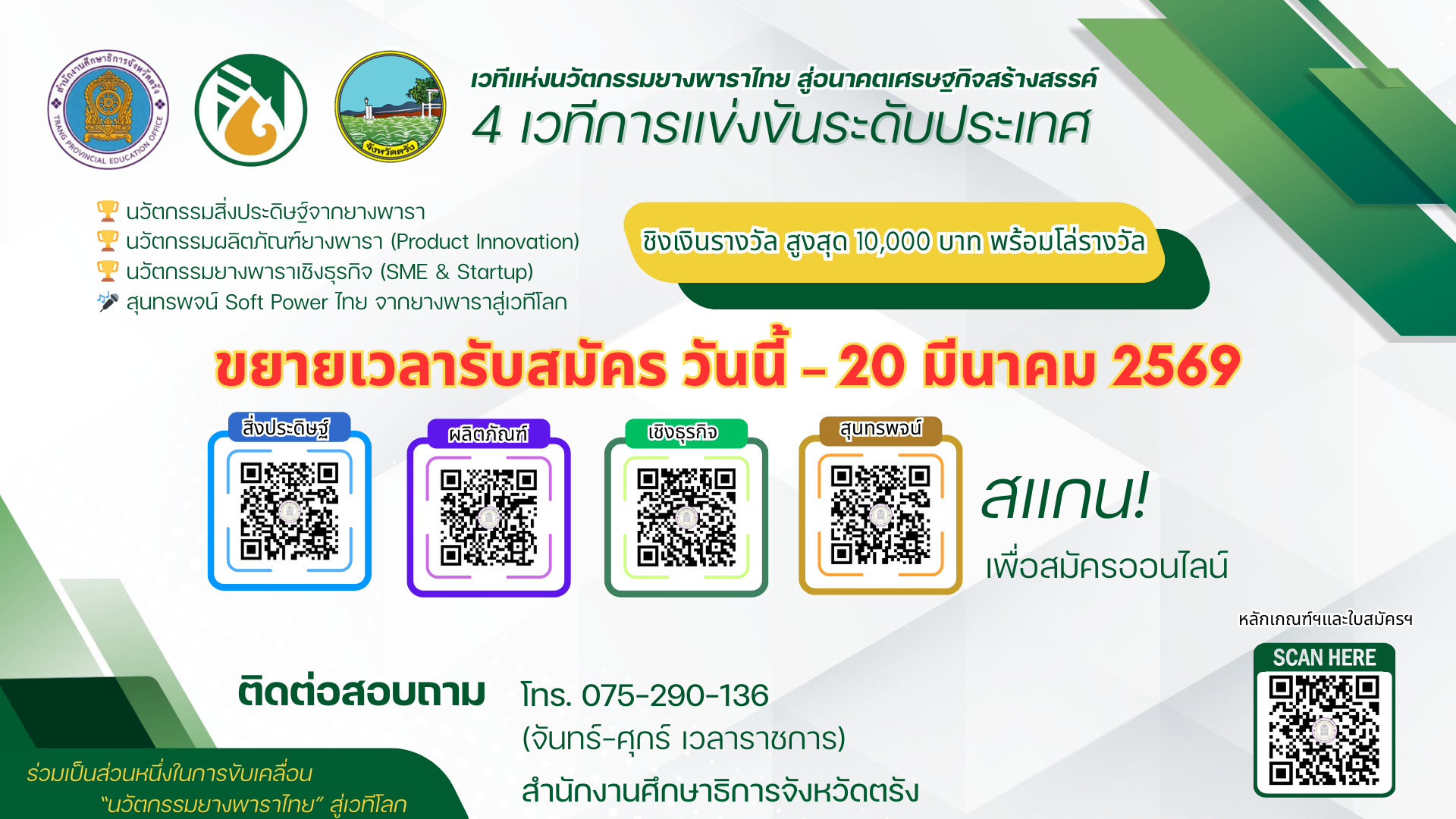 - ประกาศสำนักงานศึกษาธิการจังหวัดตรัง เรื่อง หลักเกณฑ์การประกวดแข่งขันผลงานนวัตกรรมจากยางพารา ภายใต้งานมหกรรมยางพาราและเกษตรแฟร์ เสน่ห์อันดามัน ประจำปีงบประมาณ พ.ศ. 2569
