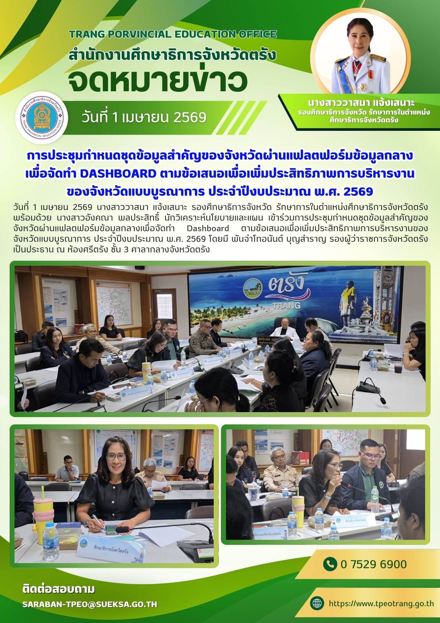 การประชุมกำหนดชุดข้อมูลสำคัญของจังหวัดผ่านแฟลตฟอร์มข้อมูลกลางเพื่อจัดทำ Dashboard ตามข้อเสนอเพื่อเพิ่มประสิทธิภาพการบริหารงานของจังหวัดแบบบูรณาการ ประจำปีงบประมาณ พ.ศ. 2569