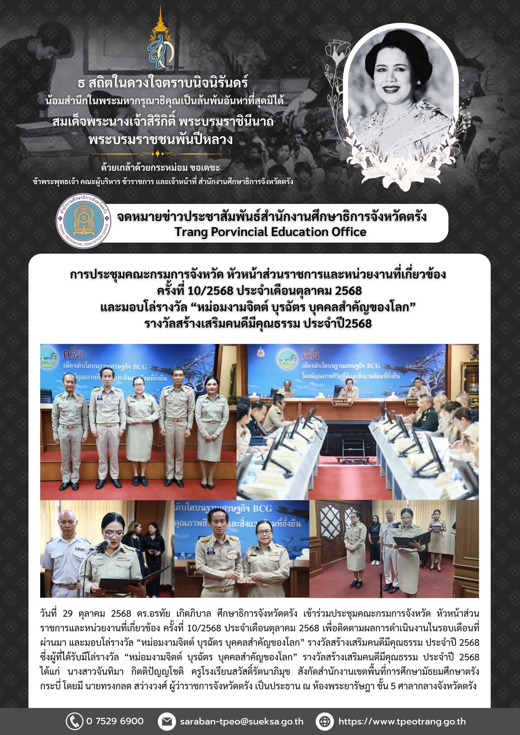 การประชุมคณะกรมการจังหวัด หัวหน้าส่วนราชการและหน่วยงานที่เกี่ยวข้องครั้งที่ 10/2568 ประจำเดือนตุลาคม 2568และมอบโล่รางวัล “หม่อมงามจิตต์ บุรฉัตร บุคคลสำคัญของโลก”รางวัลสร้างเสริมคนดีมีคุณธรรม ประจำปี2568