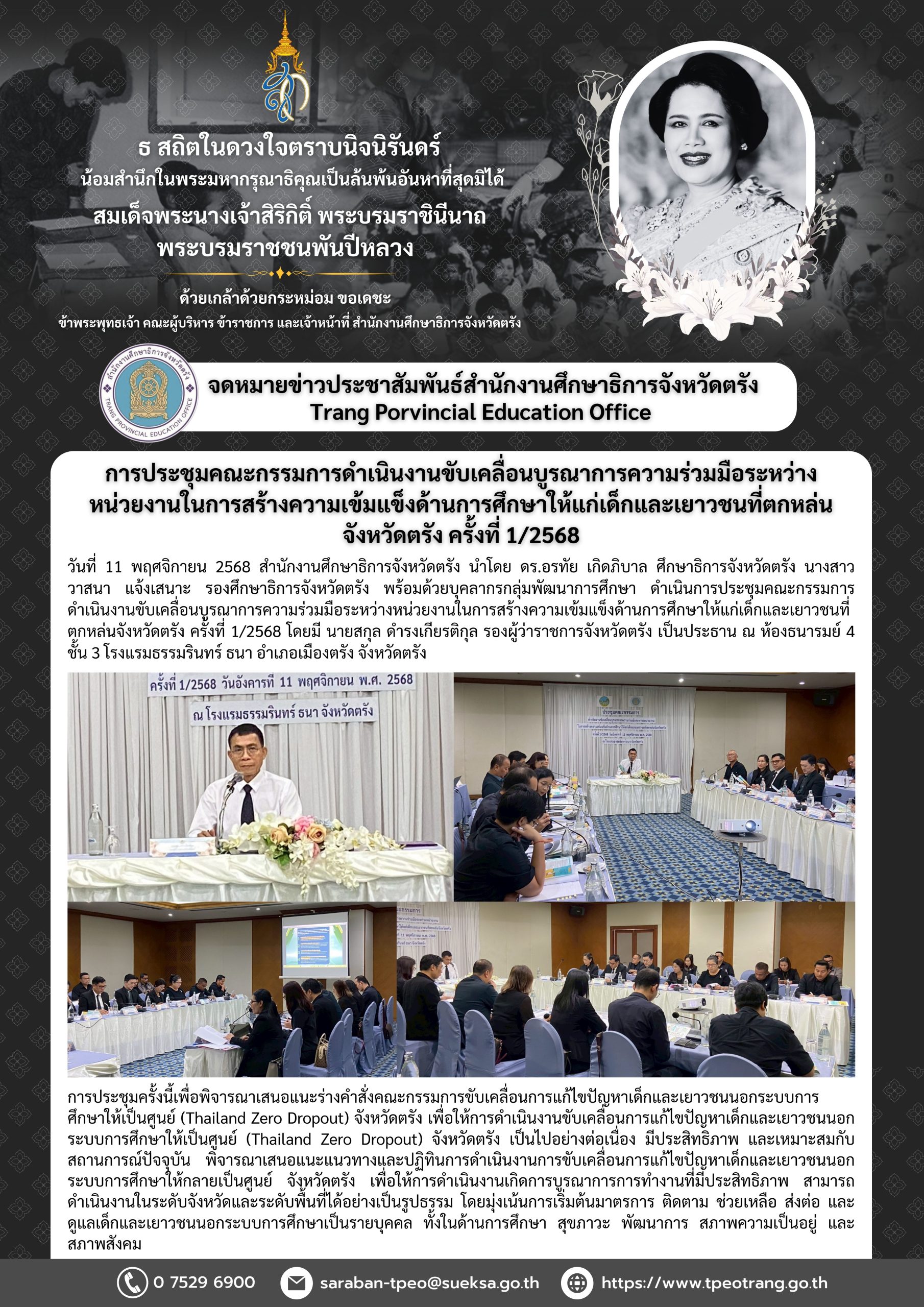 การประชุมคณะกรรมการดำเนินงานขับเคลื่อนบูรณาการความร่วมมือระหว่างหน่วยงานในการสร้างความเข้มแข็งด้านการศึกษาให้แก่เด็กและเยาวชนที่ตกหล่นจังหวัดตรัง ครั้งที่ 1/2568