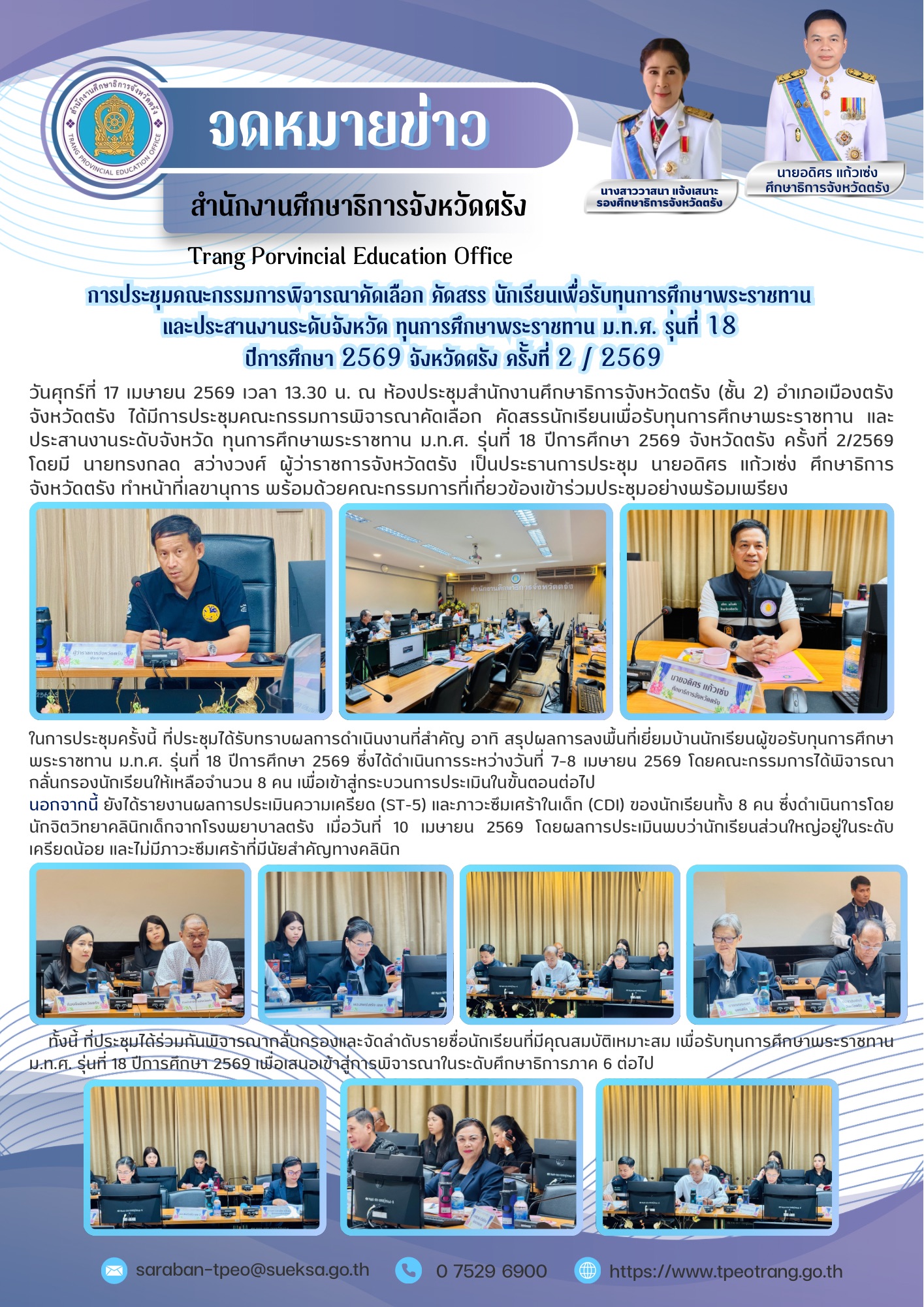การประชุมคณะกรรมการพิจารณาคัดเลือก คัดสรร นักเรียนเพื่อรับทุนการศึกษาพระราชทานและประสานงานระดับจังหวัด ทุนการศึกษาพระราชทาน ม.ท.ศ. รุ่นที่ 18 ปีการศึกษา 2569 จังหวัดตรัง ครั้งที่ 2 / 2569