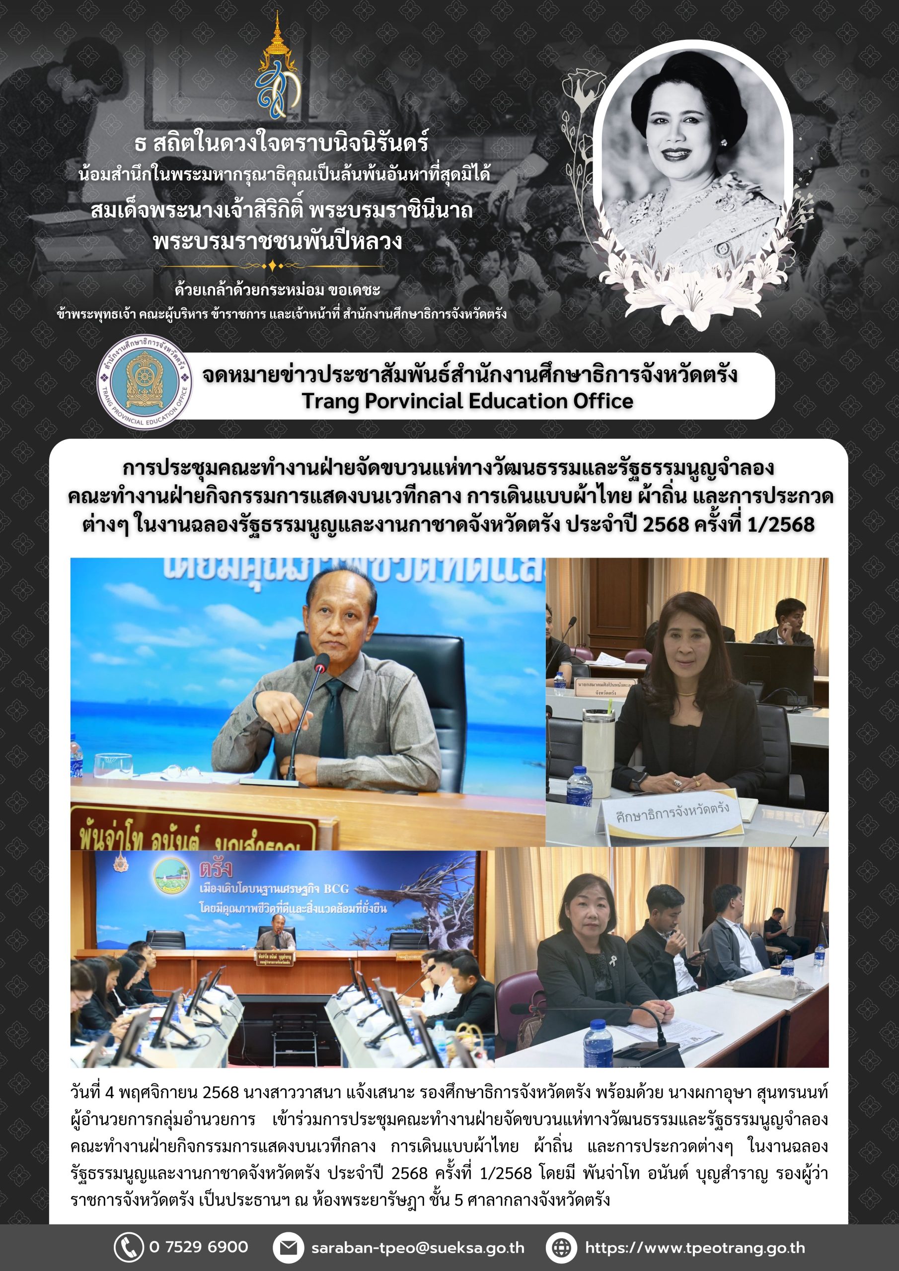 การประชุมคณะทำงานฝ่ายจัดขบวนแห่ทางวัฒนธรรมและรัฐธรรมนูญจำลองคณะทำงานฝ่ายกิจกรรมการแสดงบนเวทีกลาง การเดินแบบผ้าไทย ผ้าถิ่น และการประกวดต่างๆ ในงานฉลองรัฐธรรมนูญและงานกาชาดจังหวัดตรัง ประจำปี 2568 ครั้งที่ 1/2568
