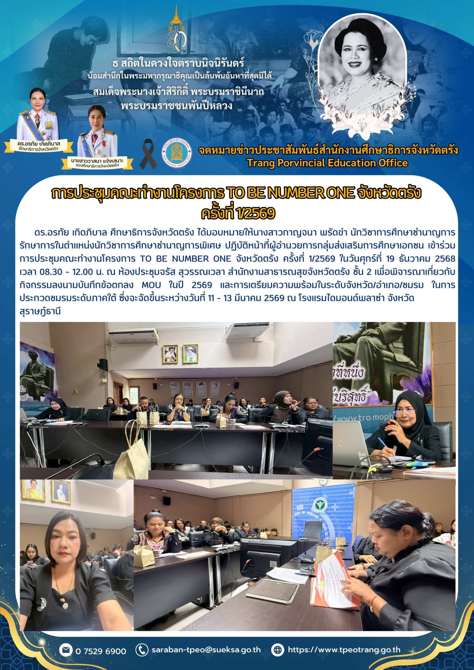 การประชุมคณะทำงานโครงการ TO BE NUMBER ONE จังหวัดตรังครั้งที่ 1/2569