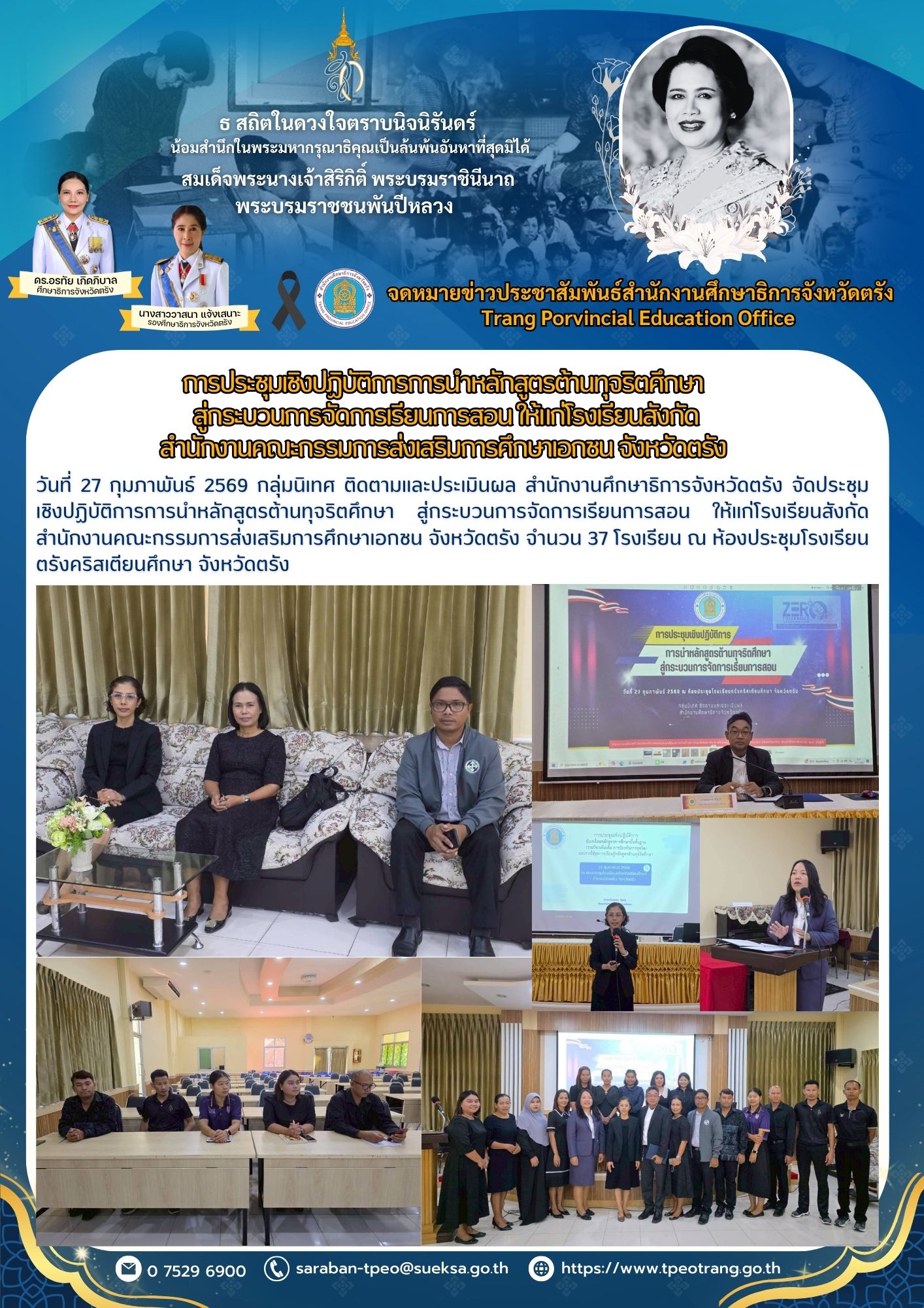 การประชุมเชิงปฏิบัติการการนำหลักสูตรต้านทุจริตศึกษาสู่กระบวนการจัดการเรียนการสอน ให้แก่โรงเรียนสังกัดสำนักงานคณะกรรมการส่งเสริมการศึกษาเอกชน จังหวัดตรัง