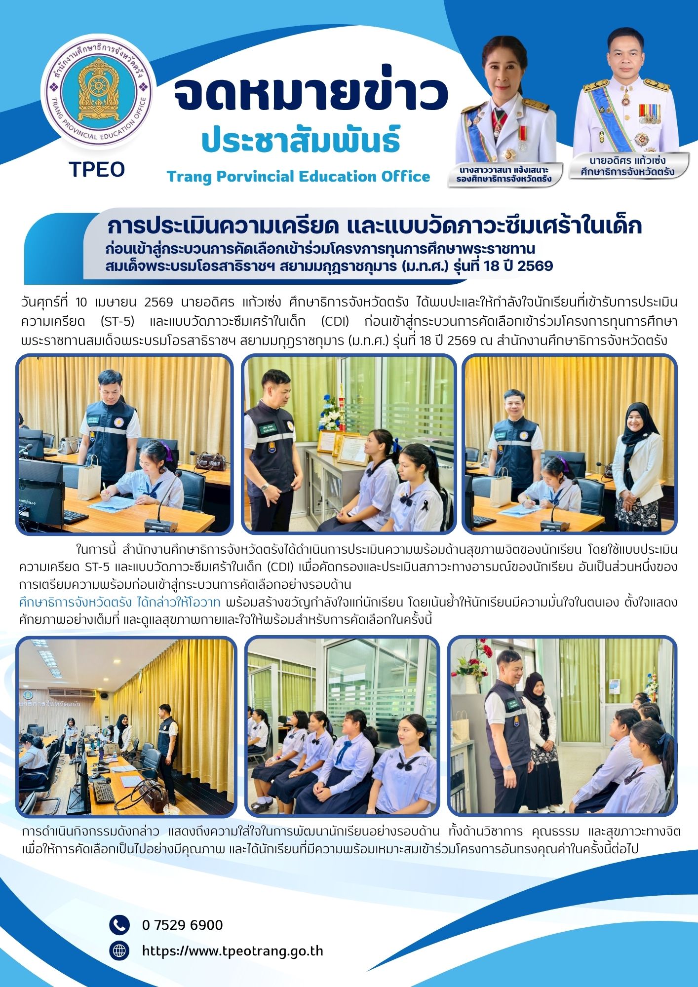 การประเมินความเครียด และแบบวัดภาวะซึมเศร้าในเด็ก ก่อนเข้าสู่กระบวนการคัดเลือกเข้าร่วมโครงการทุนการศึกษาพระราชทานสมเด็จพระบรมโอรสาธิราชฯ สยามมกุฎราชกุมาร (ม.ท.ศ.) รุ่นที่ 18 ปี 2569