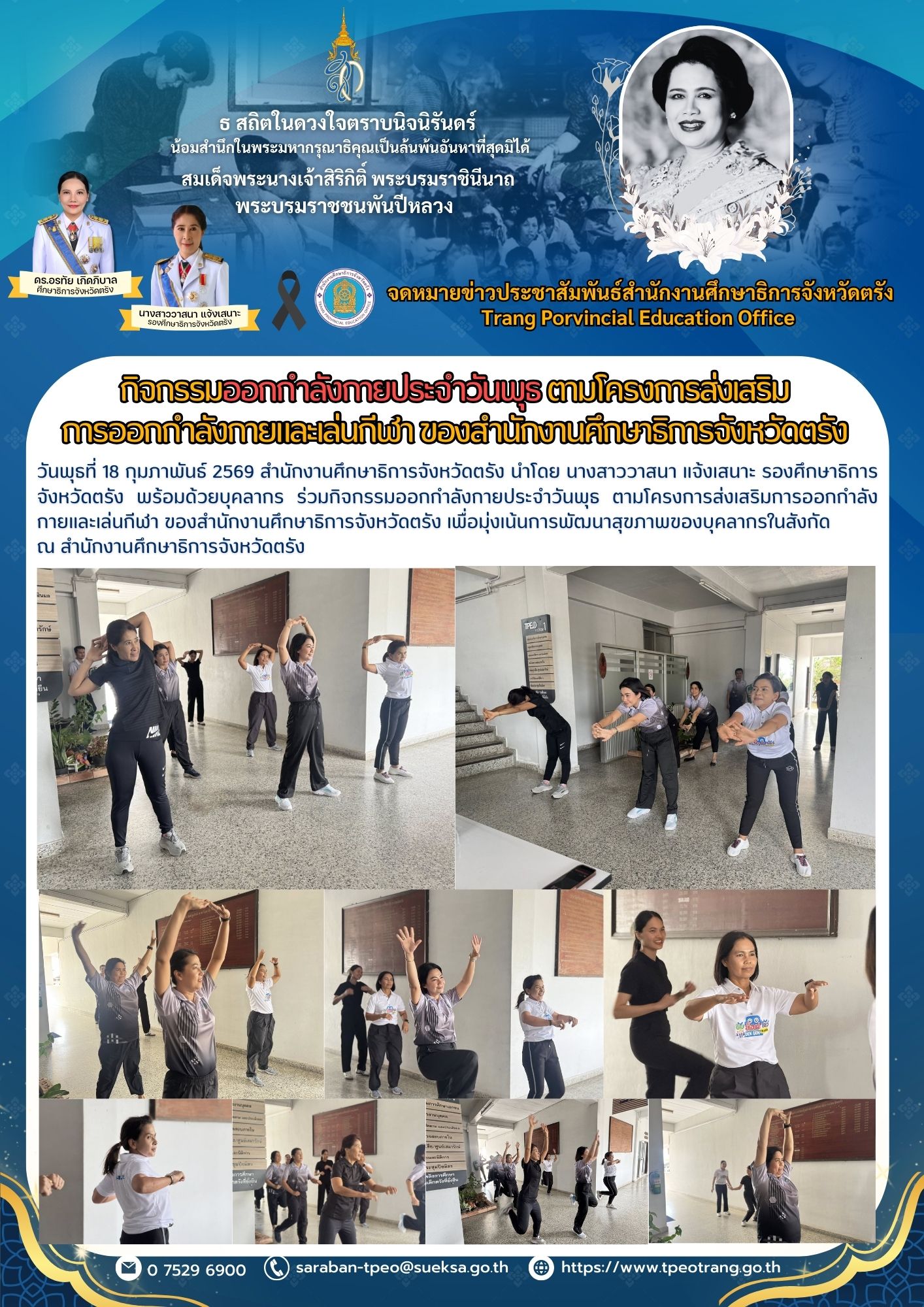 กิจกรรมออกกำลังกายประจำวันพุธ ตามโครงการส่งเสริมการออกกำลังกายและเล่นกีฬา ของสำนักงานศึกษาธิการจังหวัดตรัง