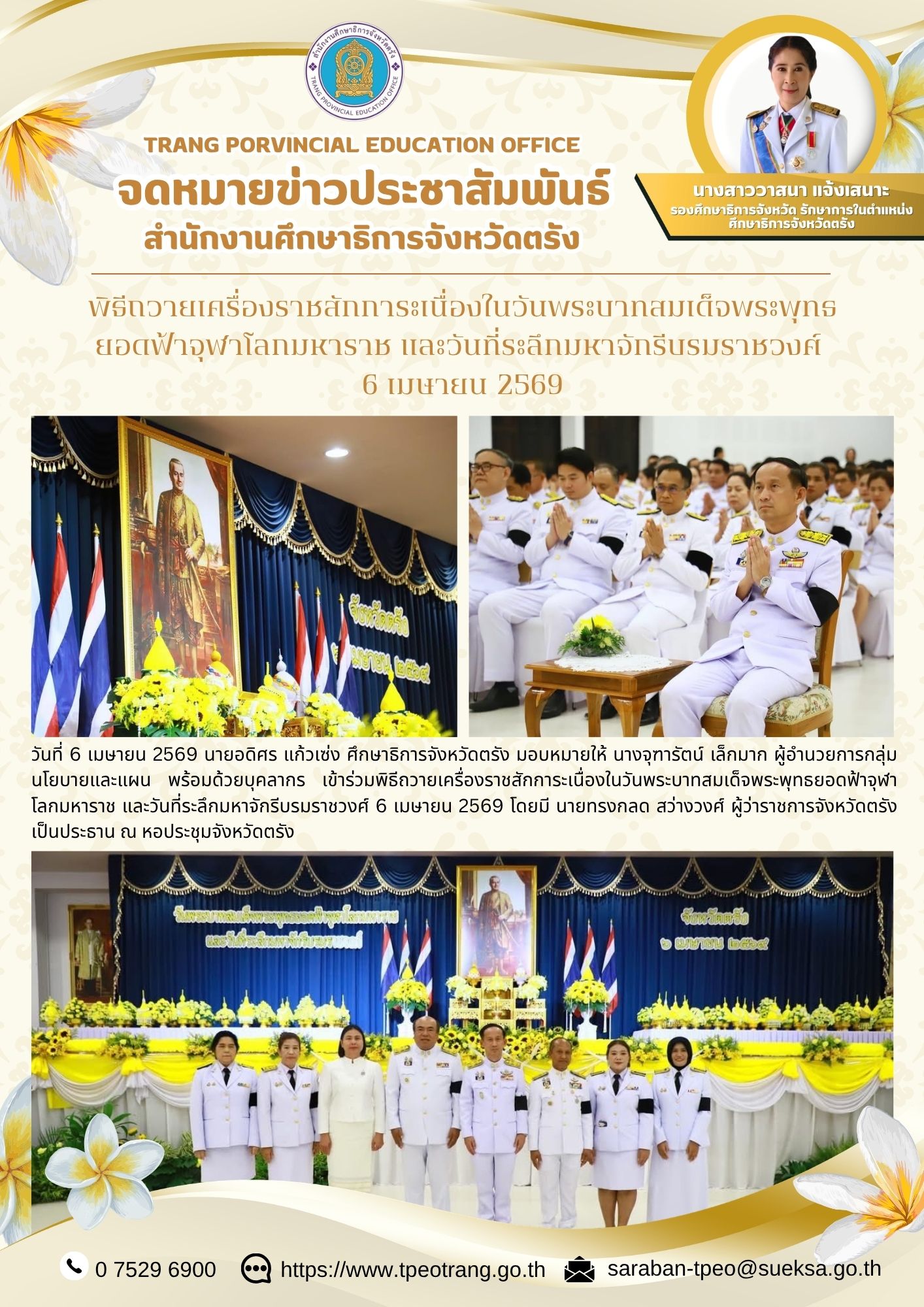 พิธีถวายเครื่องราชสักการะเนื่องในวันพระบาทสมเด็จพระพุทธยอดฟ้าจุฬาโลกมหาราช และวันที่ระลึกมหาจักรีบรมราชวงศ์ 6 เมษายน 2569