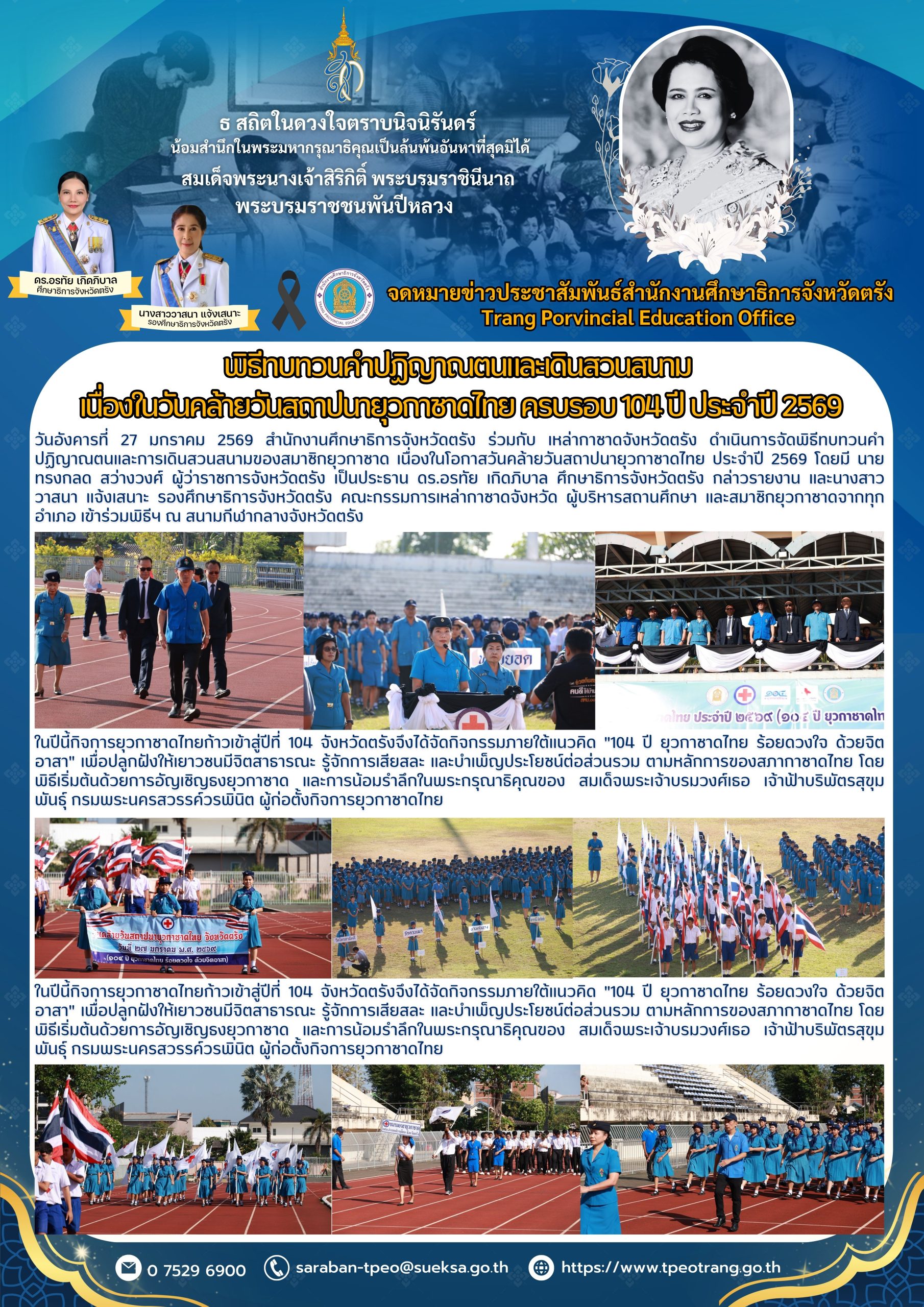 พิธีทบทวนคำปฏิญาณตนและเดินสวนสนามเนื่องในวันคล้ายวันสถาปนายุวกาชาดไทย ครบรอบ 104 ปี ประจำปี 2569