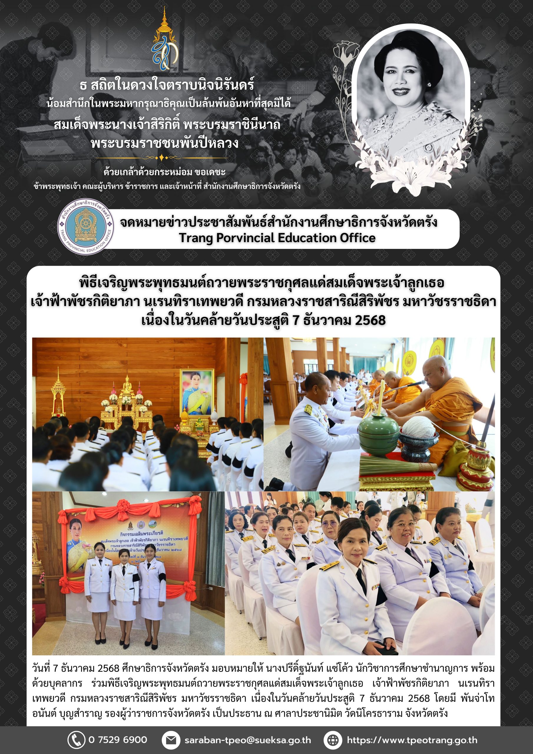 พิธีเจริญพระพุทธมนต์ถวายพระราชกุศลแด่สมเด็จพระเจ้าลูกเธอเจ้าฟ้าพัชรกิติยาภา นเรนทิราเทพยวดี กรมหลวงราชสาริณีสิริพัชร มหาวัชรราชธิดา เนื่องในวันคล้ายวันประสูติ 7 ธันวาคม 2568
