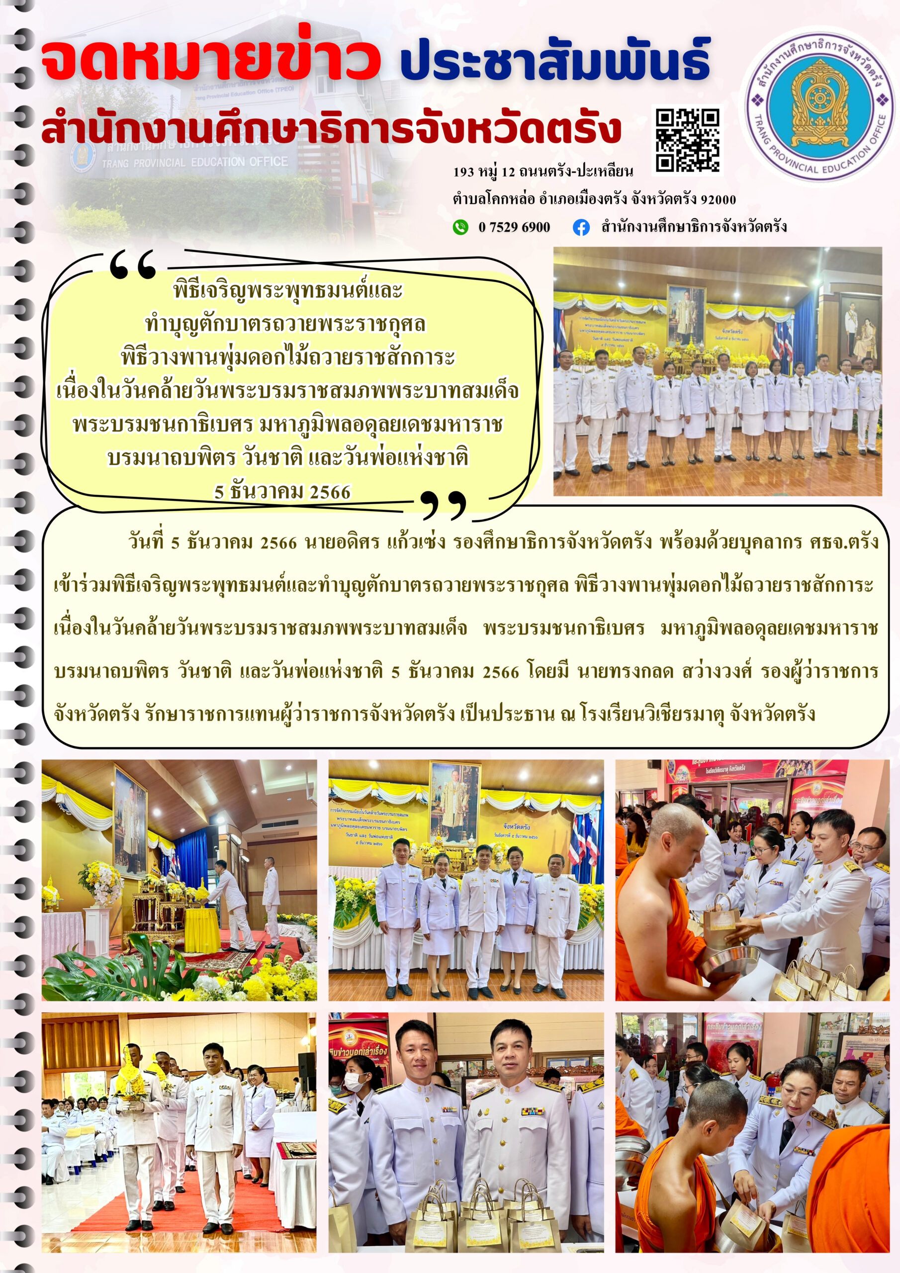 พิธีเจริญพระพุทธมนต์และทำบุญตักบาตรถวายพระราชกุศล พิธีวางพานพุ่มดอกไม้ถวายราชสักการะ เนื่องในวันคล้ายวันพระบรมราชสมภพพระบาทสมเด็จ พระบรมชนกาธิเบศร มหาภูมิพลอดุลยเดชมหาราช บรมนาถบพิตร วันชาติ และวันพ่อแห่งชาติ 5 ธันวาคม 2566