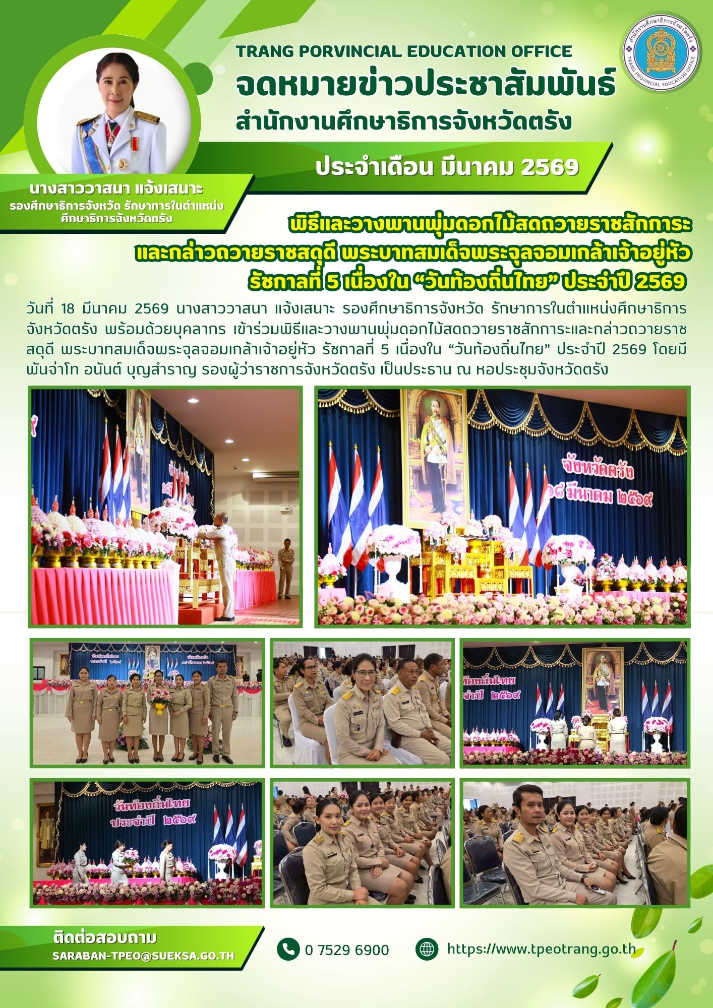 พิธีและวางพานพุ่มดอกไม้สดถวายราชสักการะและกล่าวถวายราชสดุดี พระบาทสมเด็จพระจุลจอมเกล้าเจ้าอยู่หัว รัชกาลที่ 5 เนื่องใน “วันท้องถิ่นไทย” ประจำปี 2569