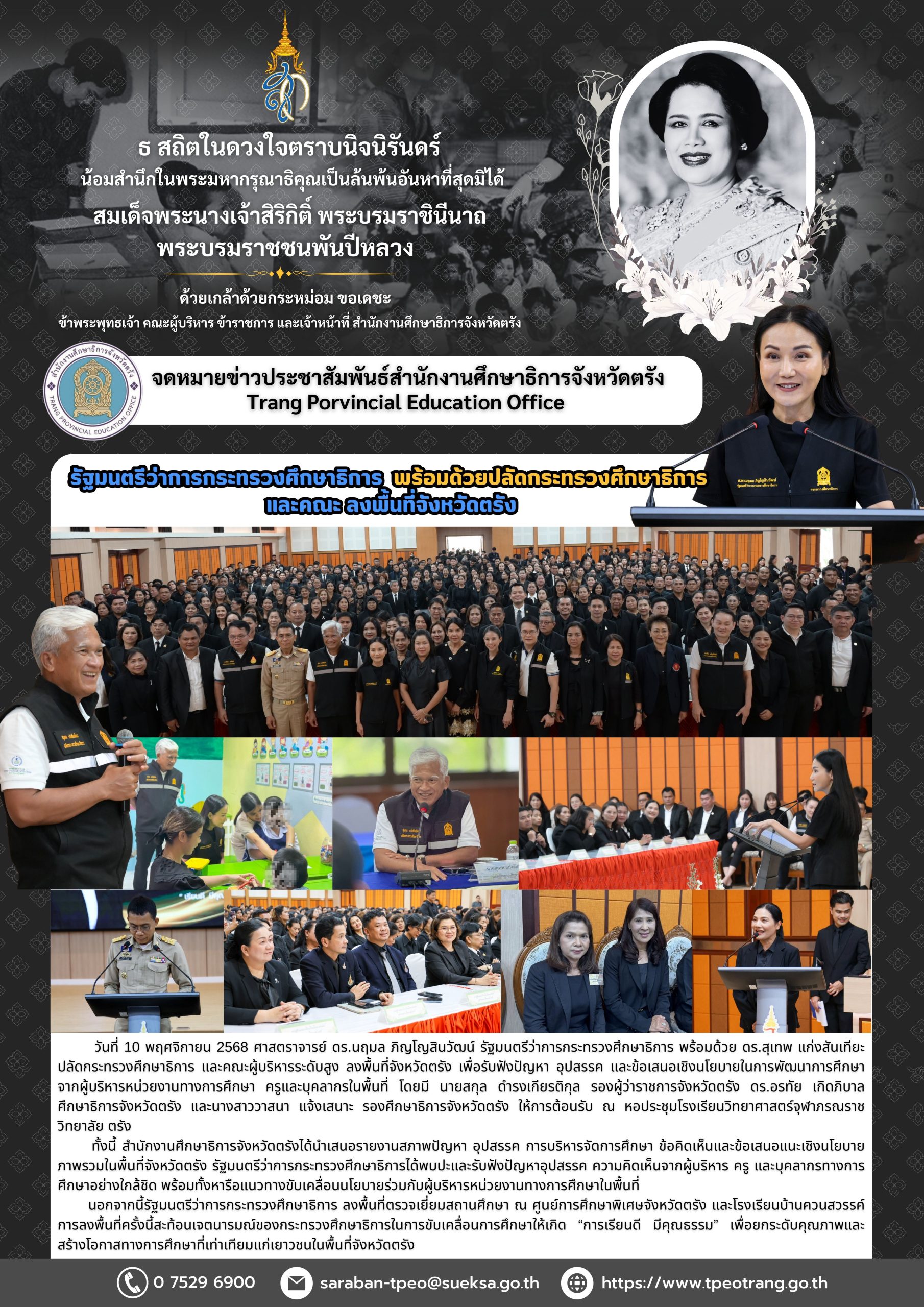รัฐมนตรีว่าการกระทรวงศึกษาธิการ พร้อมด้วยปลัดกระทรวงศึกษาธิการและคณะ ลงพื้นที่จังหวัดตรัง