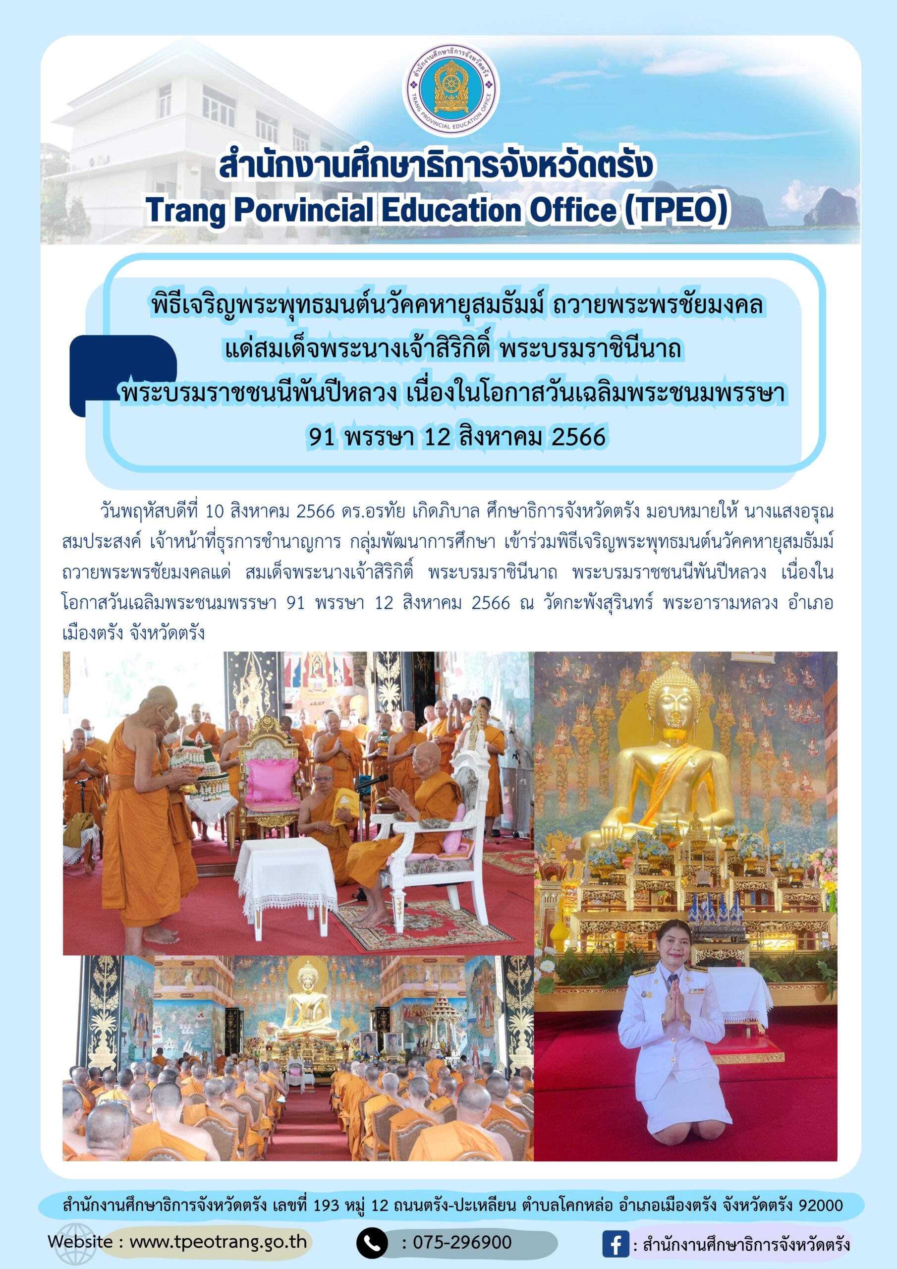 ร่วมพิธีเจริญพระพุทธมนต์นวัคคหายุสมธัมม์ ถวายพระพรชัยมงคลแด่ สมเด็จพระนางเจ้าสิริกิติ์ พระบรมราชินีนาถ พระบรมราชชนนีพันปีหลวง เนื่องในโอกาสวันเฉลิมพระชนมพรรษา 91 พรรษา 12 สิงหาคม 2566 ณ วัดกะพังสุรินทร์