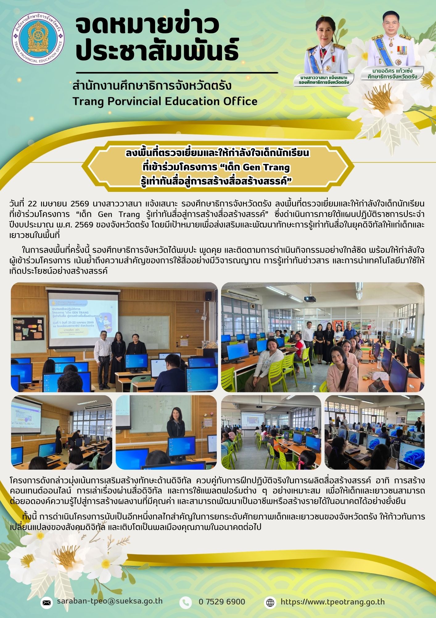 ลงพื้นที่ตรวจเยี่ยมและให้กำลังใจเด็กนักเรียนที่เข้าร่วมโครงการ “เด็ก Gen Trangรู้เท่าทันสื่อสู่การสร้างสื่อสร้างสรรค์”