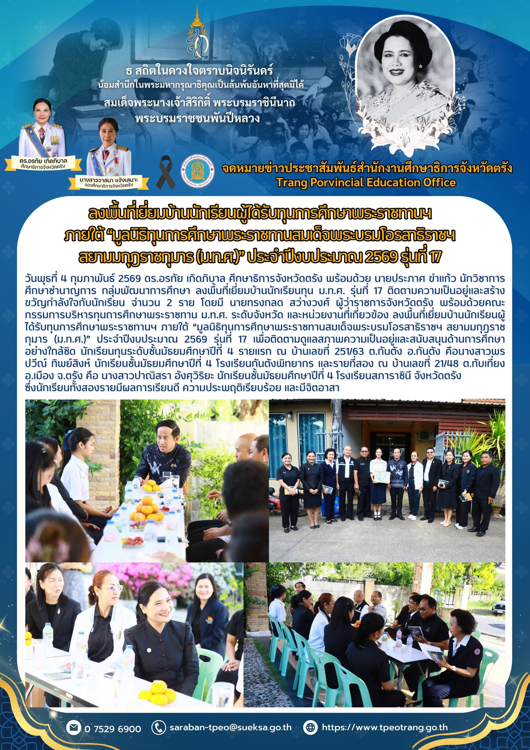 ลงพื้นที่เยี่ยมบ้านนักเรียนผู้ได้รับทุนการศึกษาพระราชทานฯภายใต้ “มูลนิธิทุนการศึกษาพระราชทานสมเด็จพระบรมโอรสาธิราชฯสยามมกุฎราชกุมาร (ม.ท.ศ.)” ประจำปีงบประมาณ 2569 รุ่นที่ 17