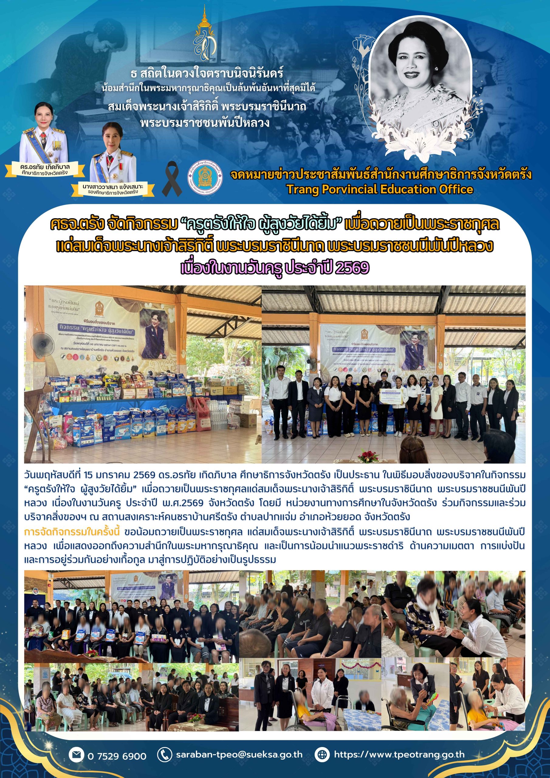ศธจ.ตรัง จัดกิจกรรม “ครูตรังให้ใจ ผู้สูงวัยได้ยิ้ม” เพื่อถวายเป็นพระราชกุศลแด่สมเด็จพระนางเจ้าสิริกิติ์ พระบรมราชินีนาถ พระบรมราชชนนีพันปีหลวง เนื่องในงานวันครู ประจำปี 2569