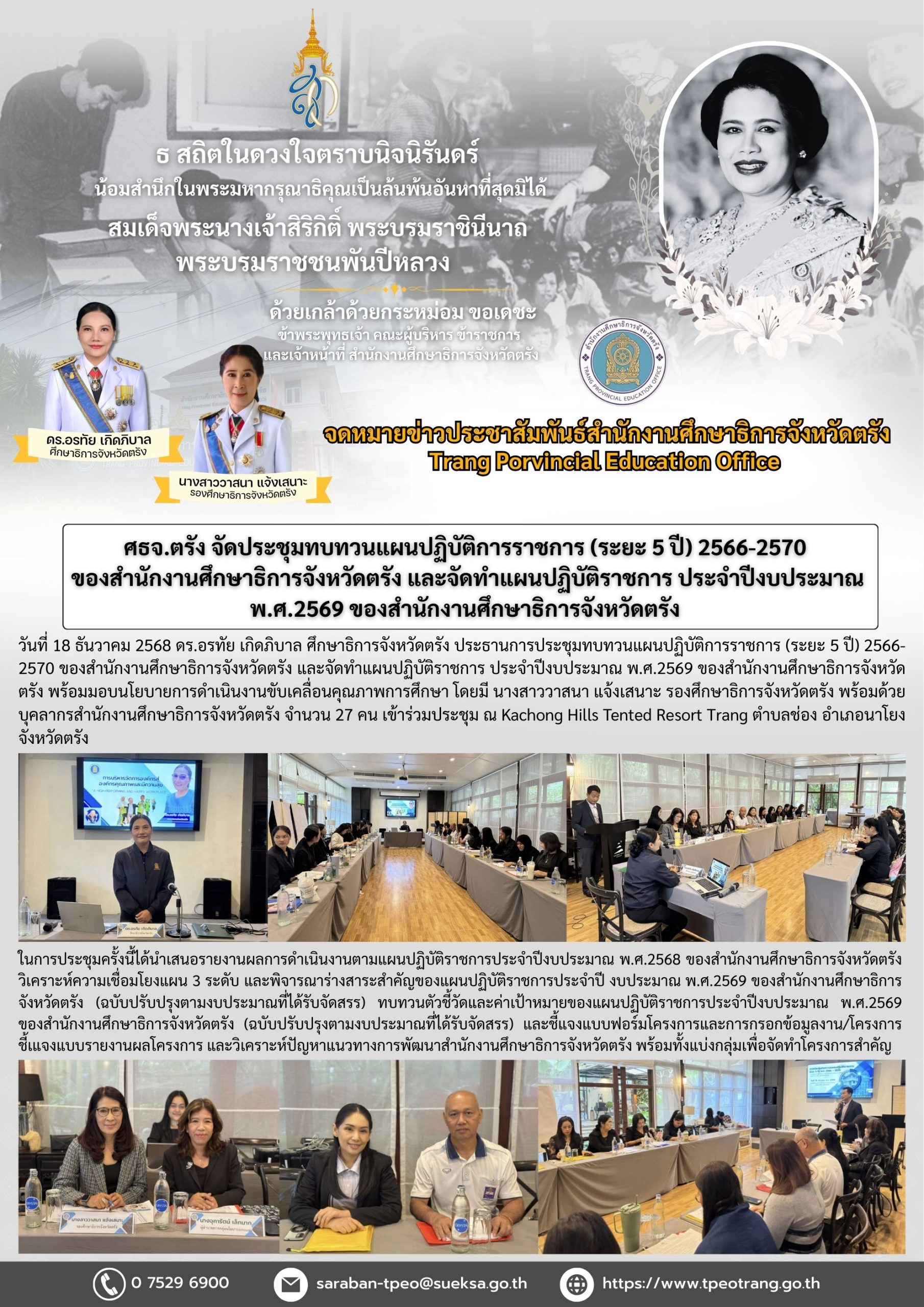 ศธจ.ตรัง จัดประชุมทบทวนแผนปฏิบัติการราชการ (ระยะ 5 ปี) 2566-2570ของสำนักงานศึกษาธิการจังหวัดตรัง และจัดทำแผนปฏิบัติราชการ ประจำปีงบประมาณ พ.ศ.2569 ของสำนักงานศึกษาธิการจังหวัดตรัง
