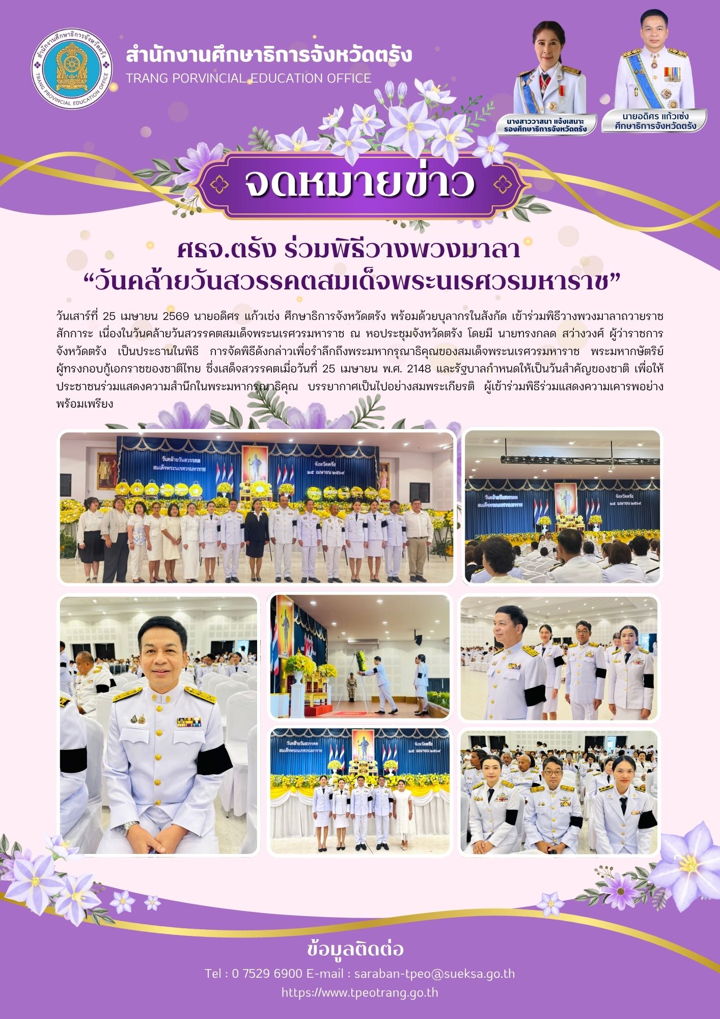 ศธจ.ตรัง ร่วมพิธีวางพวงมาลา “วันคล้ายวันสวรรคตสมเด็จพระนเรศวรมหาราช”