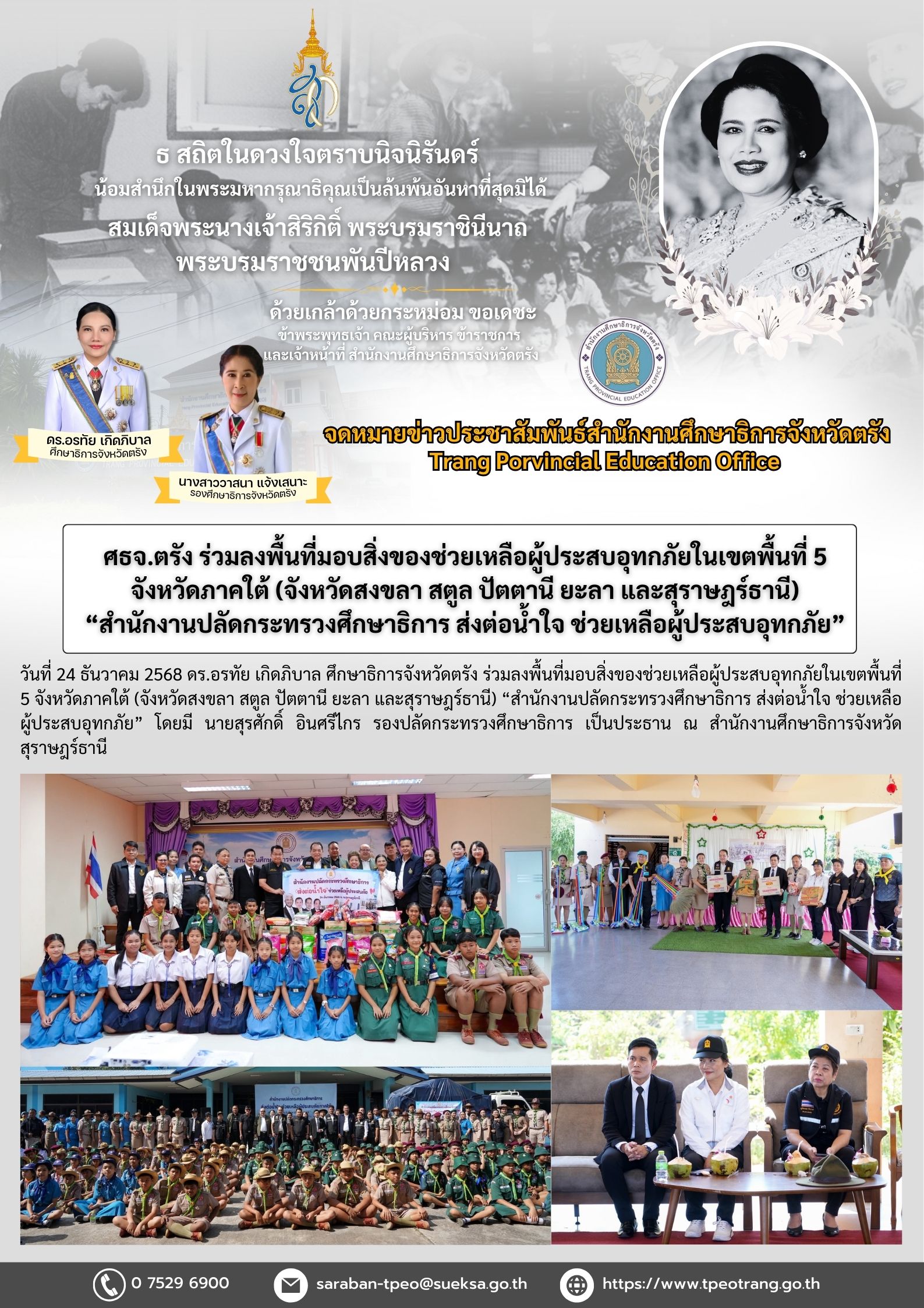 ศธจ.ตรัง ร่วมลงพื้นที่มอบสิ่งของช่วยเหลือผู้ประสบอุทกภัยในเขตพื้นที่ 5 จังหวัดภาคใต้ (จังหวัดสงขลา สตูล ปัตตานี ยะลา และสุราษฎร์ธานี) “สำนักงานปลัดกระทรวงศึกษาธิการ ส่งต่อน้ำใจ ช่วยเหลือผู้ประสบอุทกภัย”