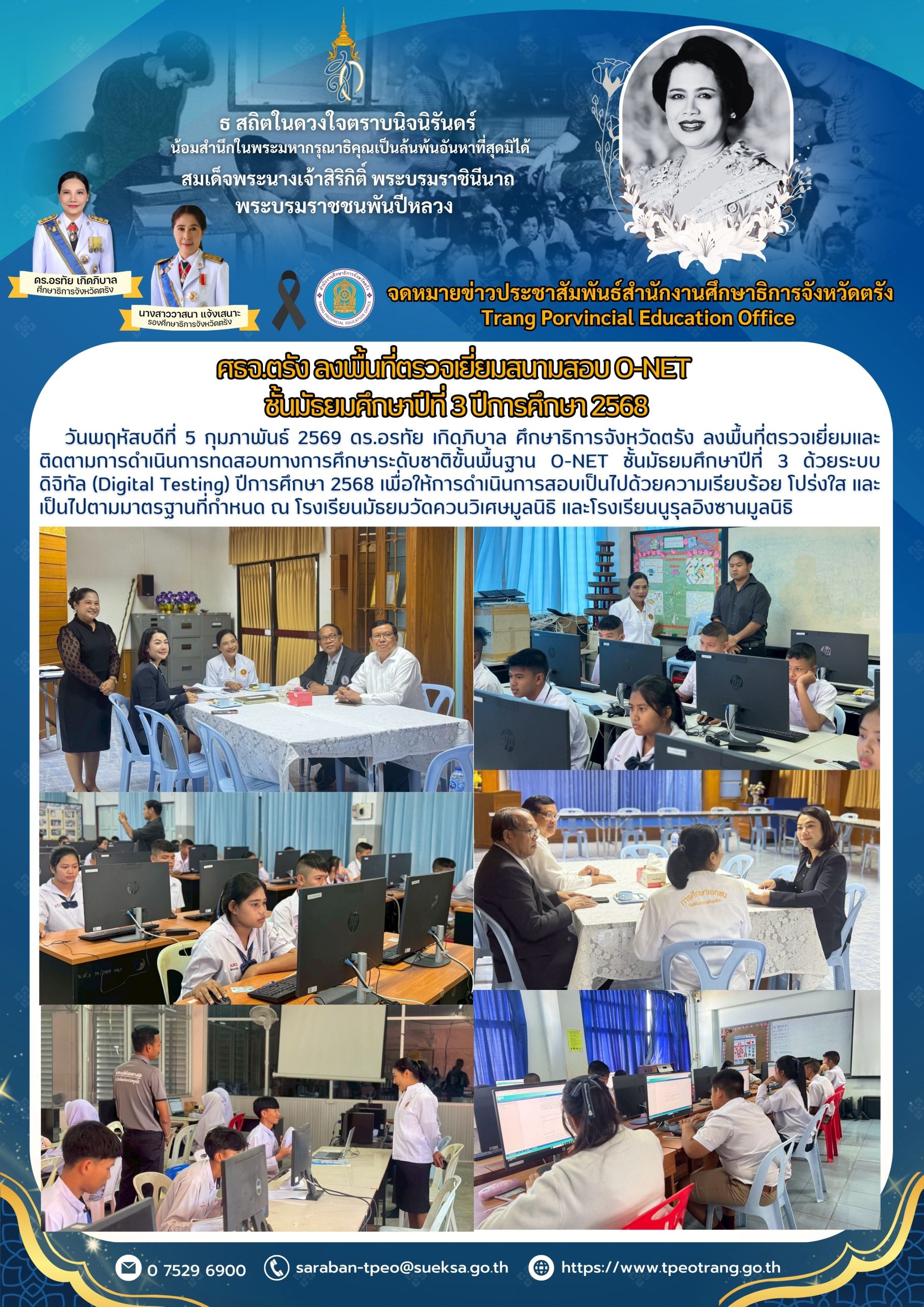 ศธจ.ตรัง ลงพื้นที่ตรวจเยี่ยมสนามสอบ O-NET ชั้นมัธยมศึกษาปีที่ 3 ปีการศึกษา 2568