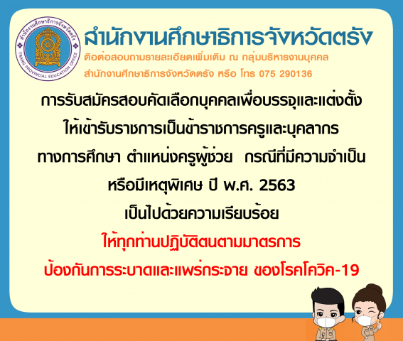 1. อนุญาตให้เฉพาะผู้สมัครฯ สามารถเข้ามาในบริเวณสำนักงานศึกษาธิการจังหวัดตรัง (ไม่อนุญาตให้ผู้ติดตามเข้ามาในบริเวณสำนักงาน)